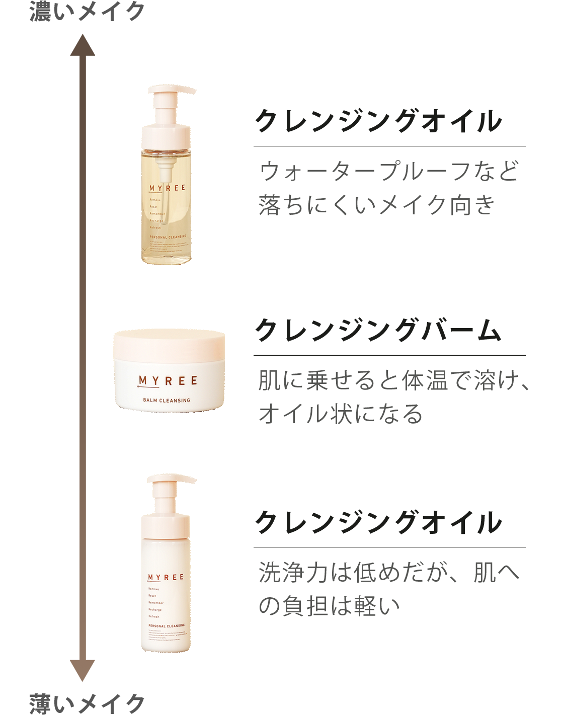 MYREEでは3種類のクレンジングをご用意しております。メイクの濃さやお肌の状態に合わせてお選びください。